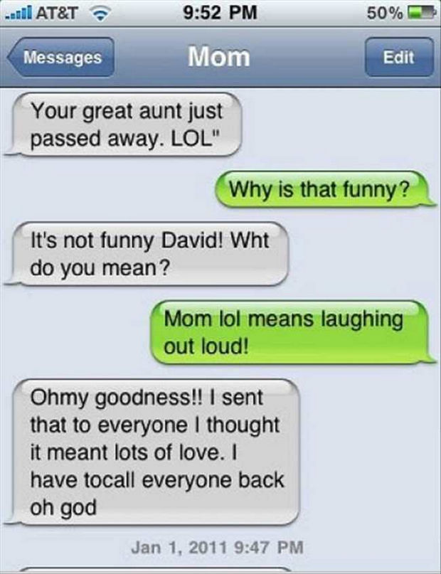 “Your great aunt just passed away. LOL. Why is that funny? It’s not funny David! What do you mean? Mom LOL means laughing out loud. Oh my goodness!! I sent that to everyone I thought it meant lots of love. I have to call everyone back oh God.”