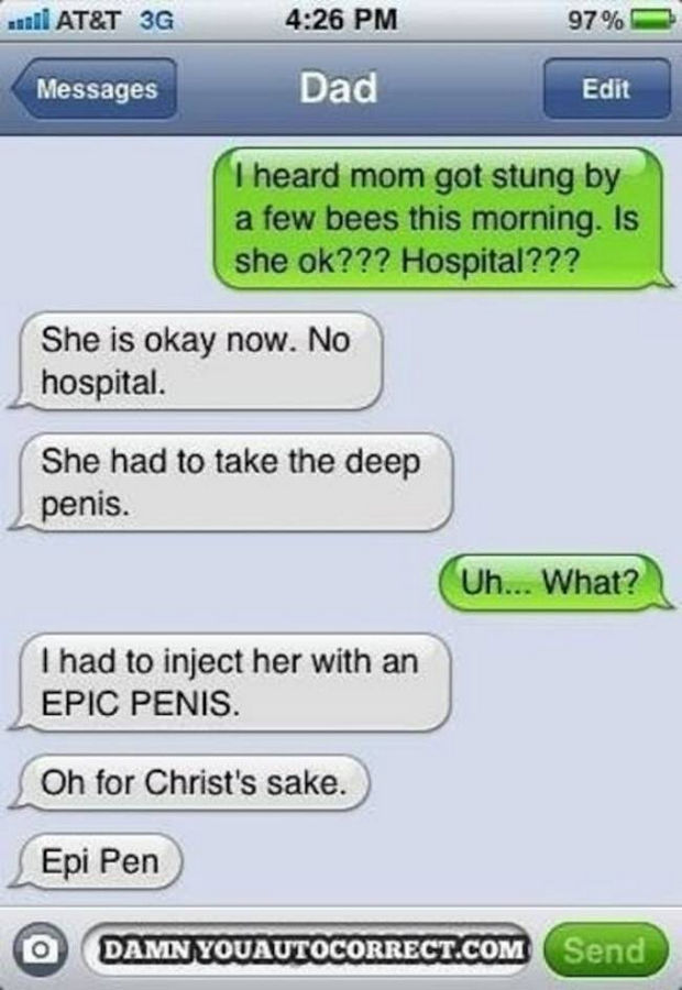 “I heard mom got stung by a few bees this morning. Is she ok??? Hospital??? She is okay now. No hospital. She had to take the deep [censored]. Uh…What? I had to inject her with an epic [censored]. Oh for Christ’s sake. Epi-Pen.”