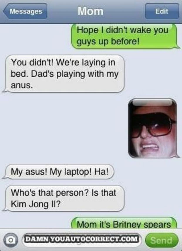 Funny texts from parents: “Hope I didn’t wake you guys up before! You didn’t! We’re laying in bed. Dad’s playing with my [censored]. My Asus! My laptop! Ha! Who’s that person? Is that Kim Jong II?”