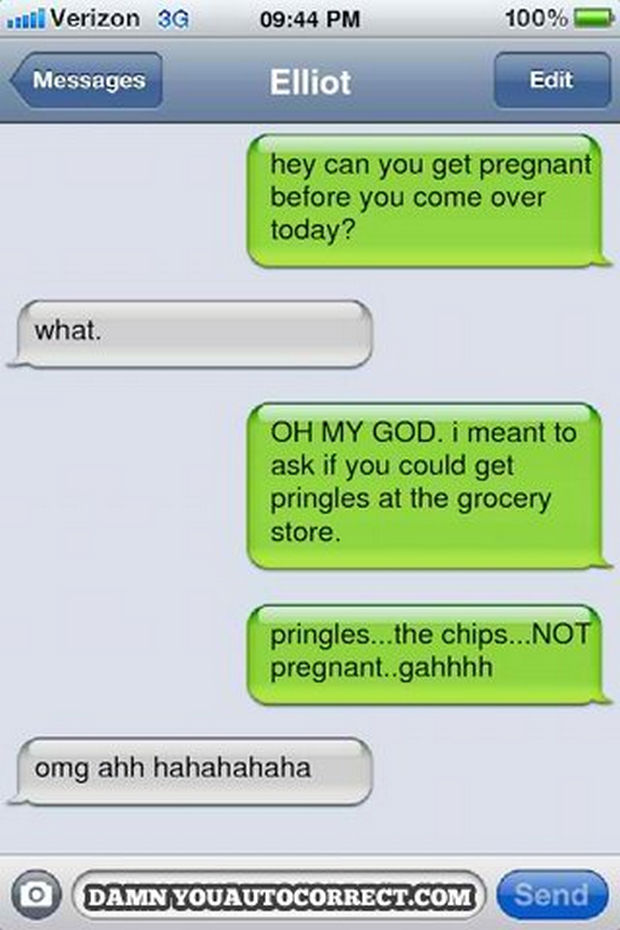 “Hey, can you get pregnant before you come over today? What. OH MY GOD. I meant to ask if you could get pringles at the grocery store. Pringles…the chips…NOT pregnant. OMG ahh hahaha.”