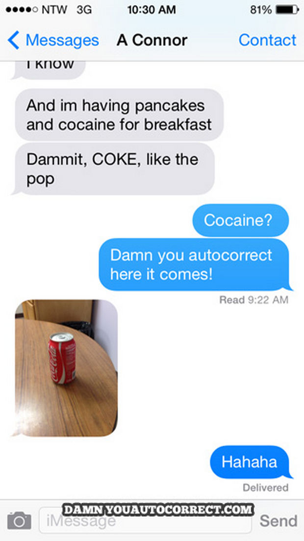 Funny texts from parents: “And I’m having pancakes and cocaine for breakfast. Dammit, COKE, like the pop. Cocaine? Damn you autocorrect here it comes! Hahaha.”