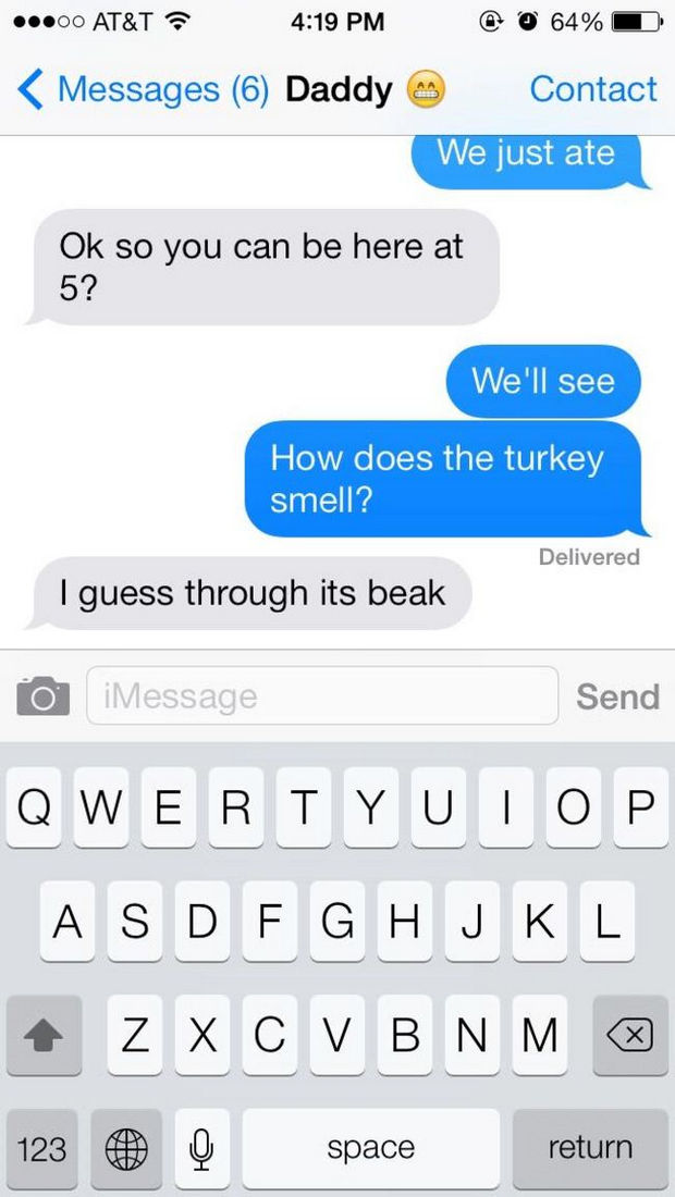 Funny texts from parents: “Ok, so you can be here at 5? We’ll see. How does the turkey smell? I guess through its beak.”