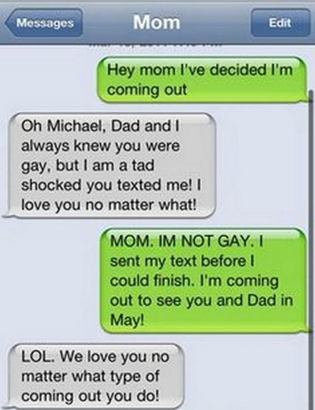 Funny texts from parents: “Hey, mom I’ve decided I’m coming out. Oh, Michael, Dad, and I always knew you were gay, but I am a tad shocked you texted me! I love you no matter what! MOM. I’m not gay! I sent my text before I could finish. I’m coming out to see you and dad in May!”