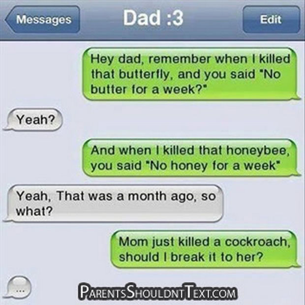 “Hey dad, remember when I killed that butterfly, and you said ‘butter for a week?’ Yeah? And when I killed that honeybee, you said ‘No honey for a week.’ Yeah, that was a month ago, so what? Mom just killed a cockroach, should I break it to her?”