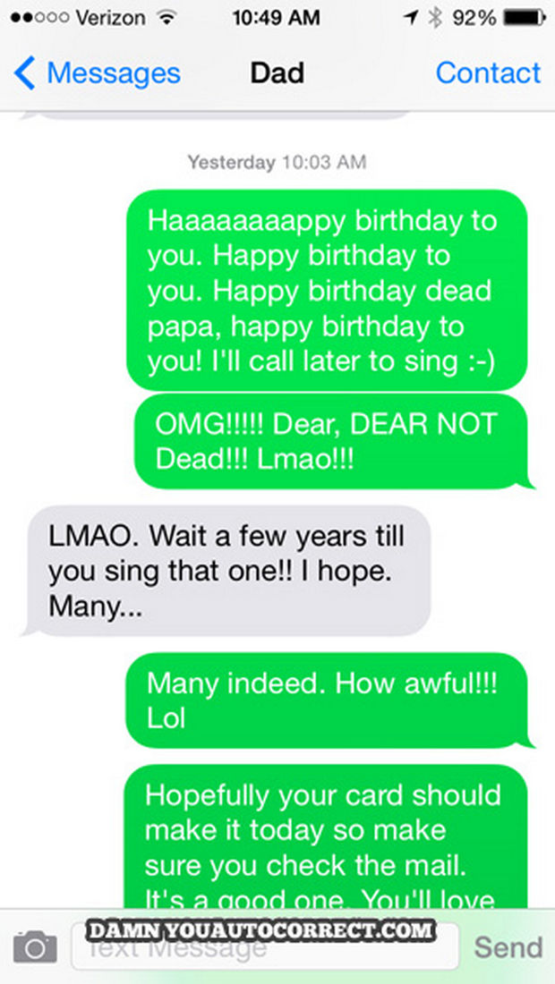 “Happy birthday to you. Happy birthday to you. Happy birthday dead papa, happy birthday to you! I’ll call later to sing :). OMG!!! Dear, DEAR NOT dead!!! Lmao!!! LMAO. Wait a few years till you sing that one!! I hope. Many…Many indeed. How awful!!! Lol. Hopefully, your card should make it today so make sure you check the mail. It’s a good one. You’ll love it.”