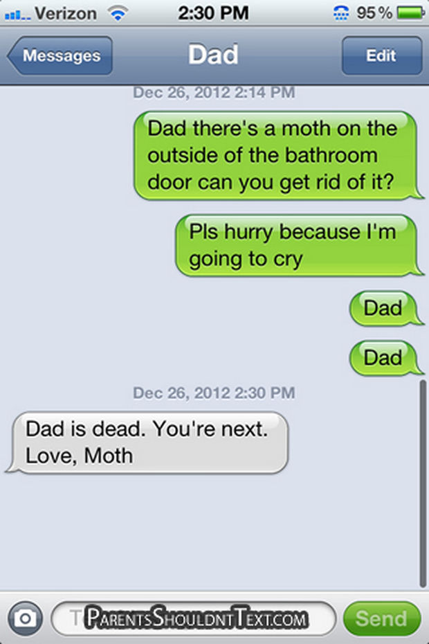 “Dad, there’s a moth on the outside of the bathroom door can you get rid of it? Pls, hurry because I’m going to cry. Dad. Dad. Dad is dead. You’re next. Love, Moth.”
