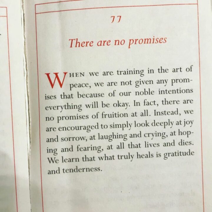 1) “When we are training in the art of peace, we are not given any promises that, because of our noble intentions, everything will be okay. In fact, there are no promises of fruition at all. Instead, we are encouraged to simply look deeply at joy and sorrow, at laughing and crying, at hoping and fearing, all that lives and dies. We learn that what truly heals is gratitude and tenderness.” – Pema Chödrön