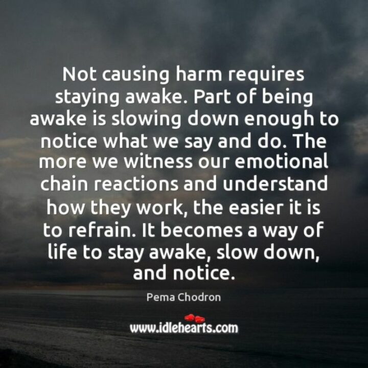 10) “Not causing harm requires staying awake. Part of being awake is slowing down enough to notice what we say and do. The more we witness our emotional chain reactions and understand how they work, the easier it is to refrain. It becomes a way of life to stay awake, slow down, and notice.” – Pema Chödrön