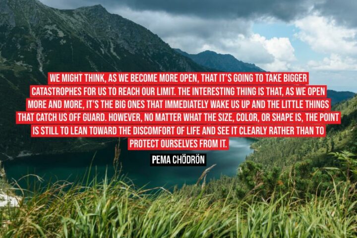 20) “We might think, as we become more open, that it’s going to take bigger catastrophes for us to reach our limit. The interesting thing is that, as we open more and more, it’s the big ones that immediately wake us up and the little things that catch us off guard. However, no matter what the size, color, or shape is, the point is still to lean toward the discomfort of life and see it clearly rather than to protect ourselves from it.” – Pema Chödrön