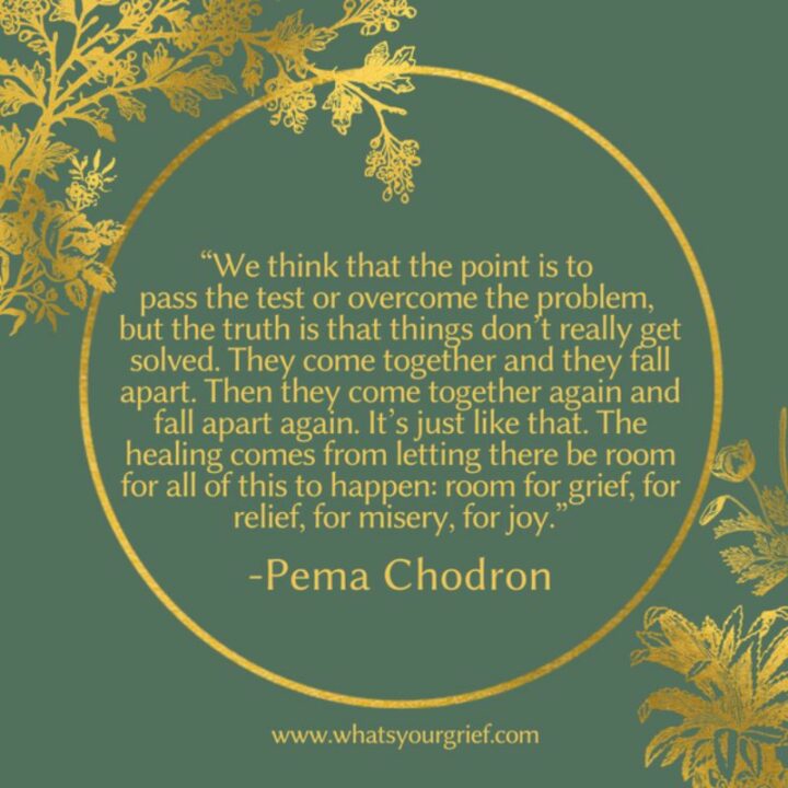 18) “We think that the point is to pass the test or overcome the problem, but the truth is that things don’t really get solved. They come together and they fall apart. Then they come together again and fall apart again. It’s just like that. The healing comes from letting there be room for all of this to happen: room for grief, for relief, for misery, for joy.” – Pema Chödrön