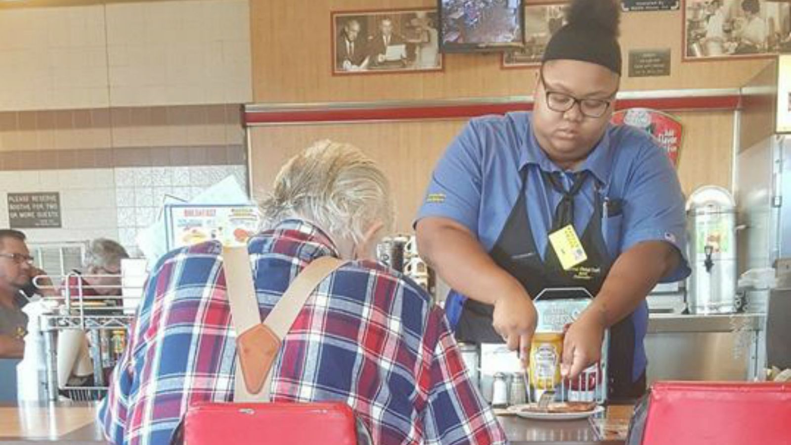 Waitress Helps a Customer with His Meal and Is Presented with a College Scholarship by the Mayor