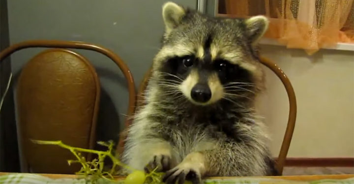 Wild animals like raccoons love to eat food. They might even tackle the neighbor’s trash can with their tiny fingers to fetch table scraps. One lucky raccoon got an opportunity to sit at the kitchen table and eat some sweet and delicious grapes.