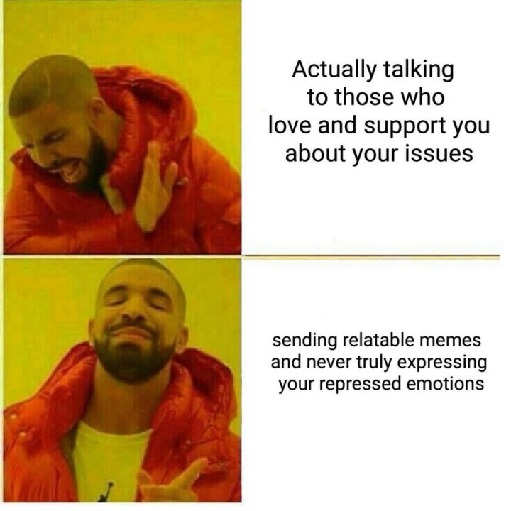 “Actually talking to those who love and support you about your issues. Sending relatable memes and never truly expressing your repressed emotions.”