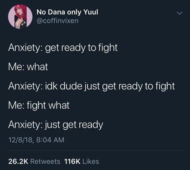 “Anxiety: Get ready to fight. Me: What. Anxiety: I don’t know dude just get ready to fight. Me: Fight what. Anxiety.: Just get ready.”