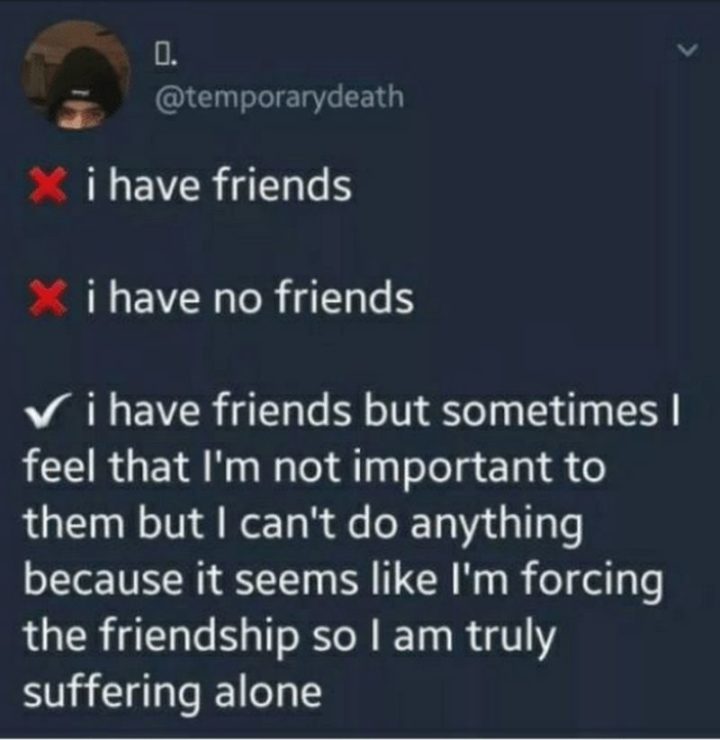 “I have friends. I have no friends. I have friends but sometimes I feel that I’m not important to them but I can’t do anything because it seems like I’m forcing the friendship so I am truly suffering alone.”