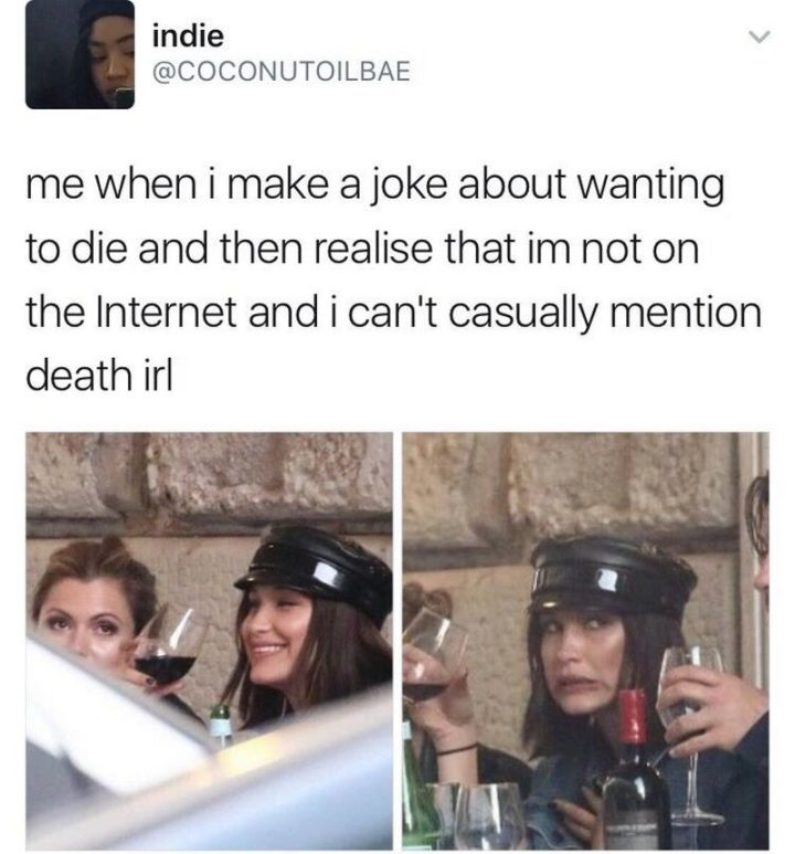 “Me when I make a joke about wanting to die and then realize that I’m not on the internet and I can’t casually mention death in real life.”