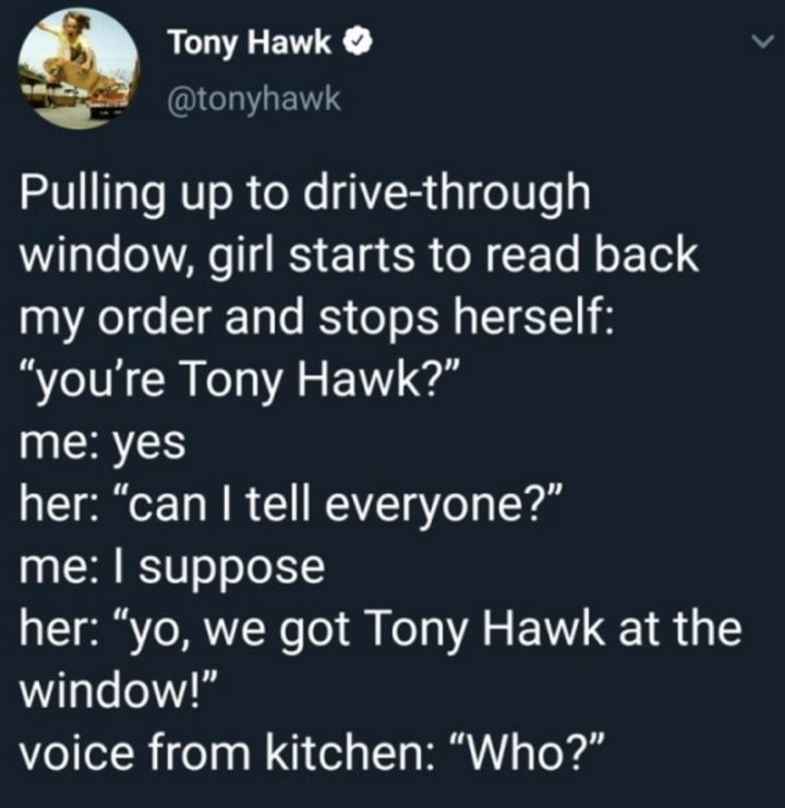 “Pulling up to the drive-through window, the girl starts to read back my order and stops herself: You’re Tony Hawk? Me: Yes. Her: Can I tell everyone? Me: I suppose. Her: Yo, we got Tony Hawk at the window! The voice from kitchen: Who?”