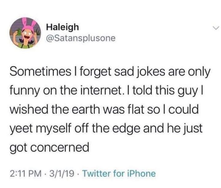 “Sometimes I forget sad jokes are only funny on the internet. I told this guy I wished the earth was flat so I could yeet myself off the edge and he just got concerned.”