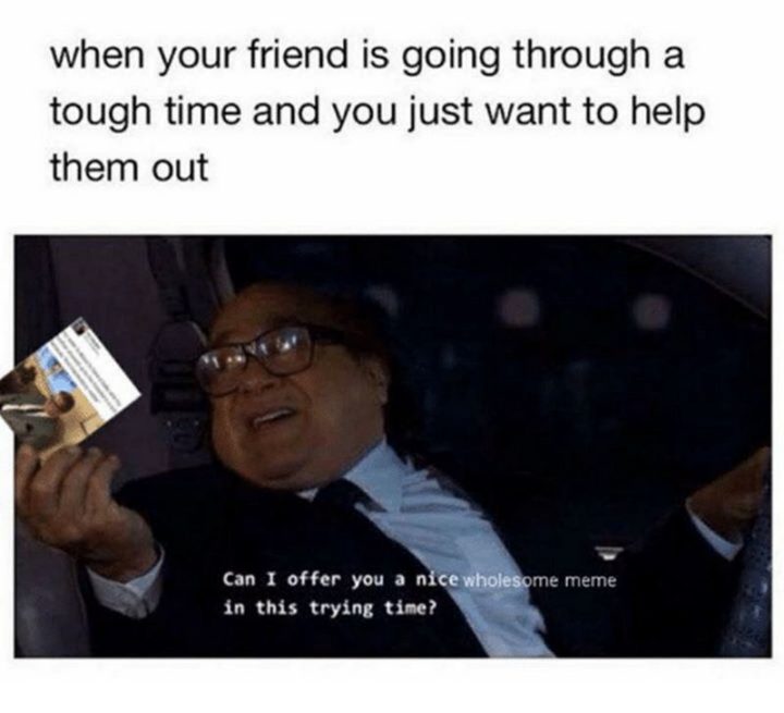 “When your friend is going through a tough time and you just want to help them out. Can I offer you a nice wholesome meme in this trying time?”