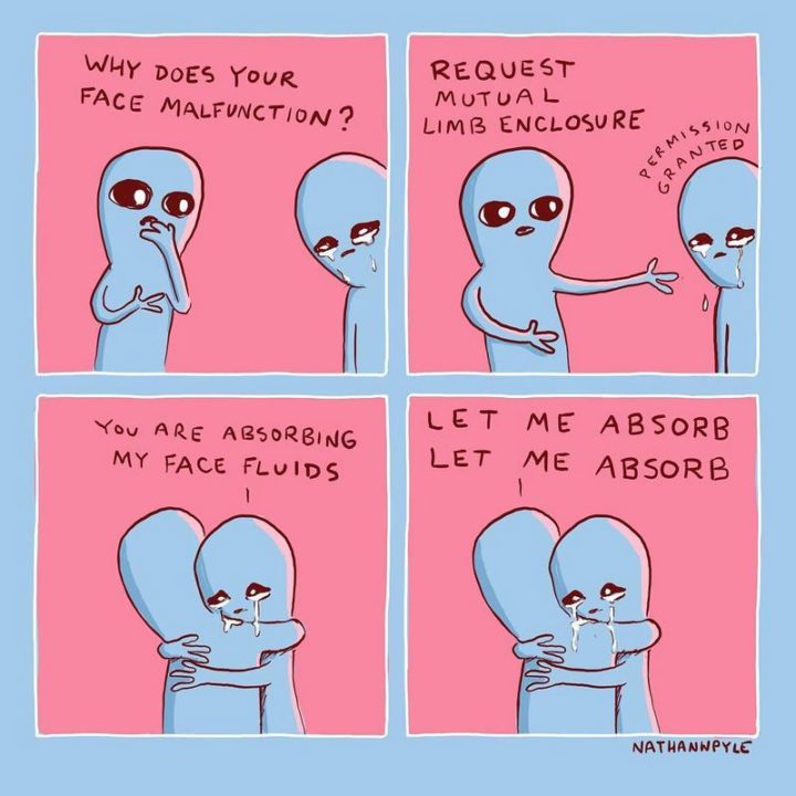 “Why does your face malfunction? Request a mutual limb enclosure. Permission granted. You are absorbing my fluids. Let me absorb. Let me absorb.”