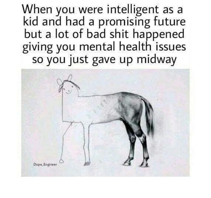“When you were intelligent as a kid and had a promising future but a lot of bad $#!t happened to give you mental health issues so you just gave up midway.”