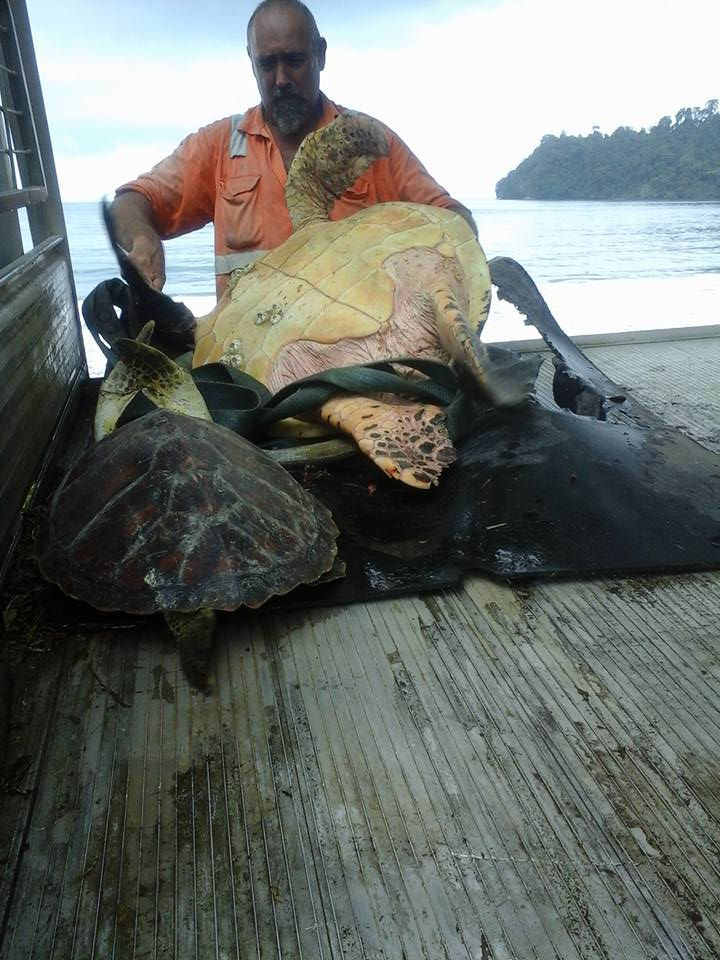 Culling carries the sea turtle so that he can release them back to the ocean and rescue them.