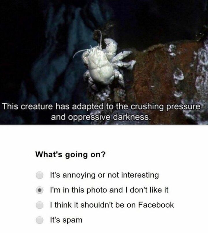 24) “This creature has adapted to the crushing pressure and oppressive darkness. What’s going on? It’s annoying or not interesting. I’m in the photo and I don’t like it. I think it shouldn’t be on Facebook. It’s spam.”