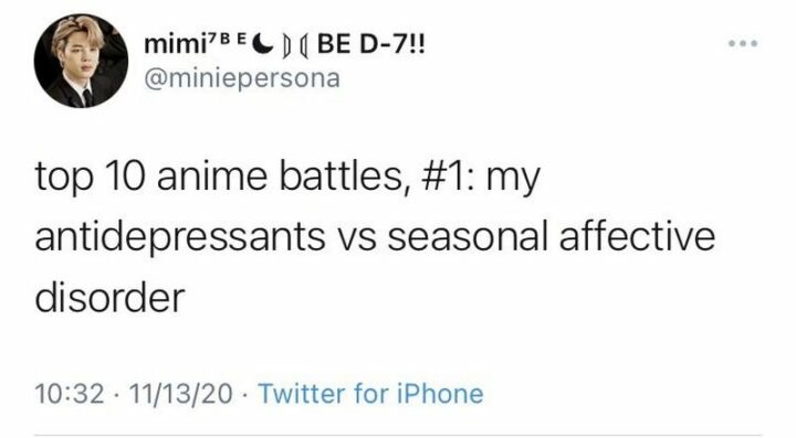25) “Top 10 anime battles, #1: My antidepressants VS seasonal affective disorder.”