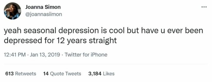 32) “Yeah, seasonal depression is cool but have u ever been depressed for 12 years straight.”
