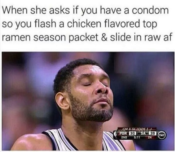 “When she asks if you have a condom so you flash a chicken-flavored top ramen season packet and slide in raw AF.”