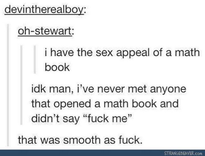 “I have the sex appeal of a math boIDK Idk man, I’ve never met anyone that opened a math book and didn’t say ‘[censored] me.’ That was smooth as [censored].”