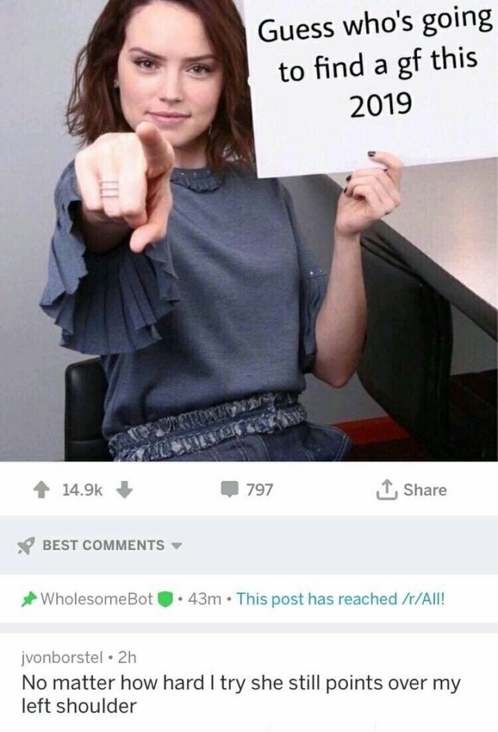 “Guess who’s going to find a girlfriend this 2019. No matter how hard I try she still points over my left shoulder.”