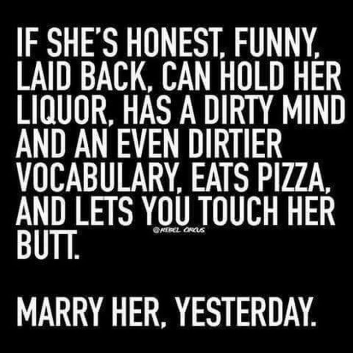 “If she’s honest, funny, laid back, can hold her liquor, has a dirty mind and an even dirtier vocabulary, eats pizza, and lets you touch her butt. Marry her, yesterday.”