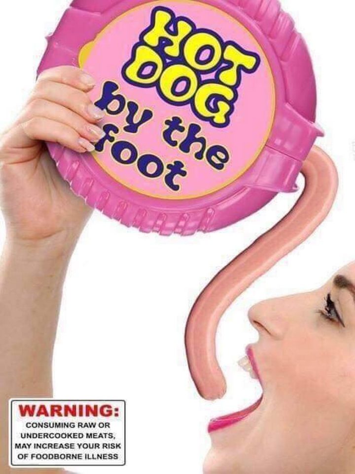 “Hot dog by the foot. Warning: Consuming raw or undercooked meats, may increase your risk of foodborne illness.”