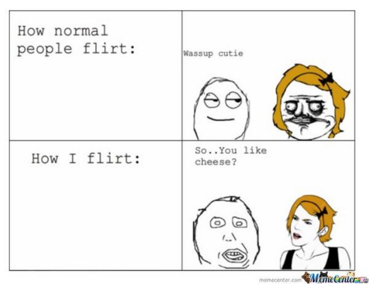 “How normal people flirt: Wassup cutie. How I flirt: So…you like cheese?”