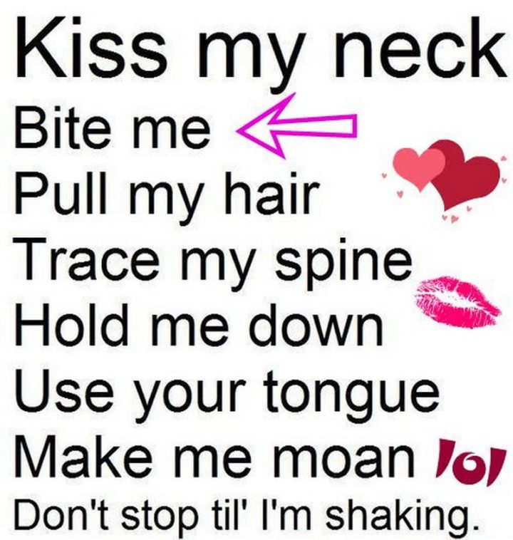 “Kiss my neck. Bite me. Pull my hair. Trace my spine. Hold me down. Use your tongue. Make me moan. Don’t stop til’ I’m shaking.”
