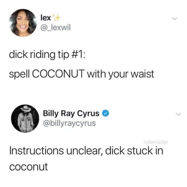 “[censored] riding tip #1: Spell COCONUT with your waist. Instructions unclear, [censored] stuck in coconut.”
