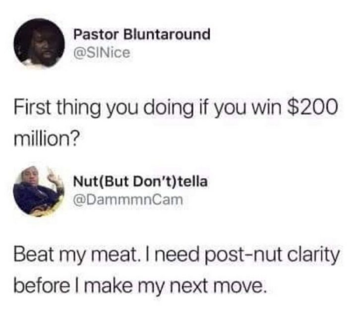 “First thing you doing if you win $200 million? Beat my meat. I need post-nut clarity before I make my next move.”