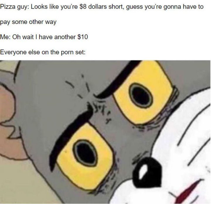 “Pizza guy: Looks like you’re dollars short, guess you’re gonna have to pay some other way. Me: Oh wait, I have another $10. Everyone else on the [censored] set:”