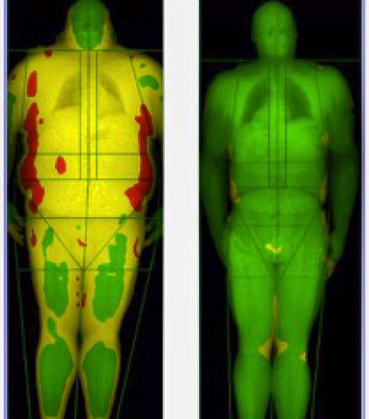 Pasquale Brocco took an IDXA body scan before and after losing the weight and the results are dramatic. The yellow areas represent body fat and red areas represent dangerous levels of body fat.