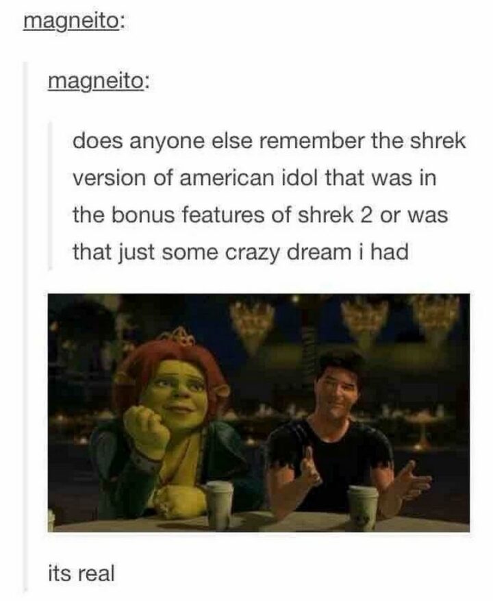 “Does anyone else remember the Shrek version of American Ido that was in the bonus feature of Shrek 2 or was that just some crazy dream I had? It’s real.”