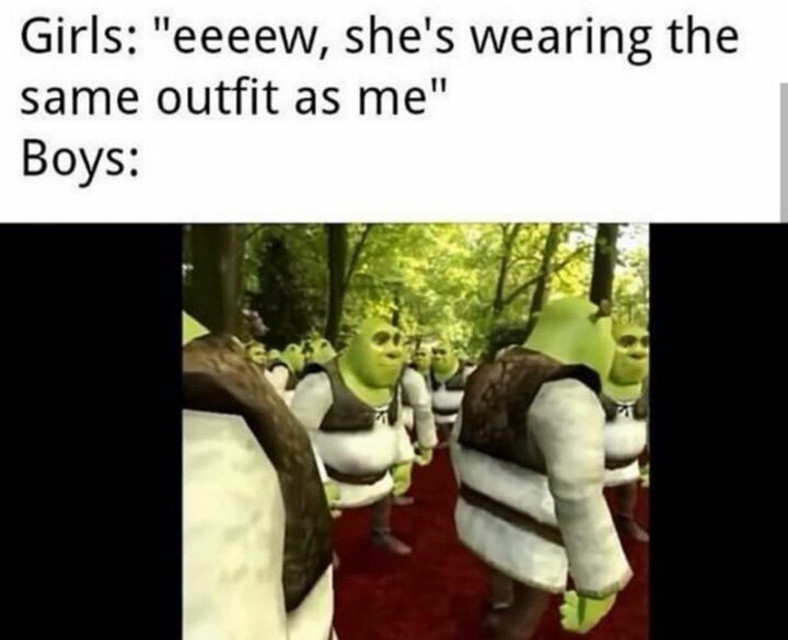 “Girls: Eeeew, she’s wearing the same outfit as me. Boys:”