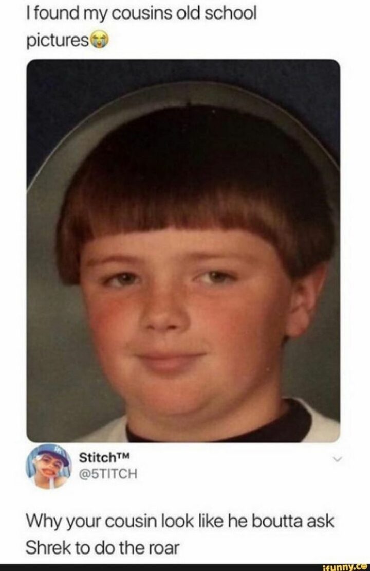 “I found my cousin’s old school pictures. Why does your cousin look like he’s about to ask Shrek to do the roar.”