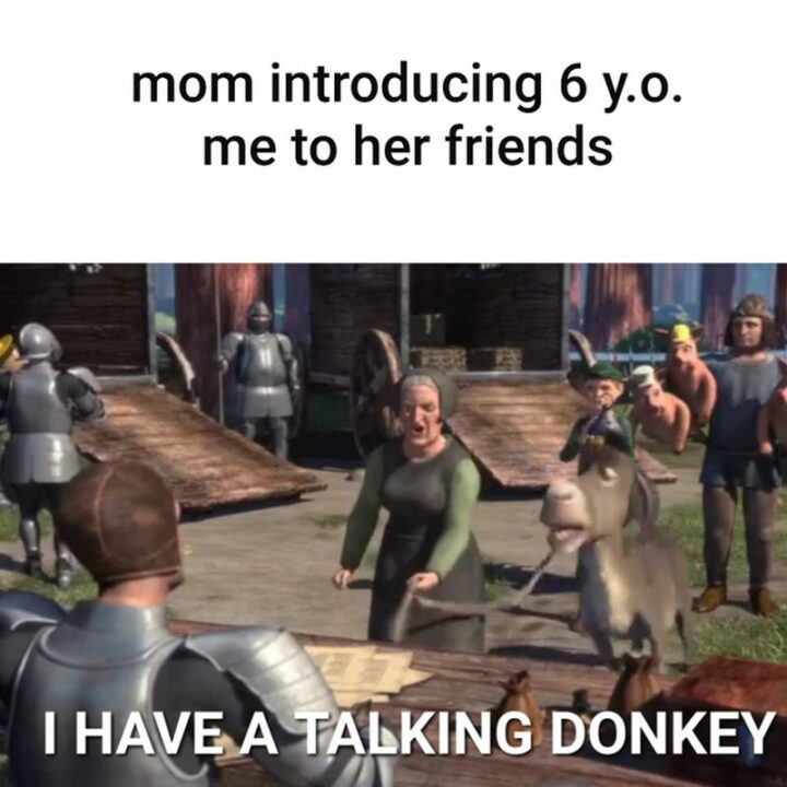 “Mom introducing 6-year-old me to her friends: I have a talking donkey.”