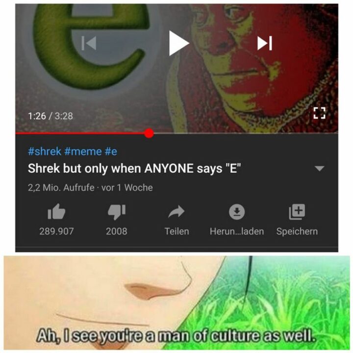 “Shrek but only when ANYONE says ‘E.’ Ah, I see you’re a man of culture as well.”