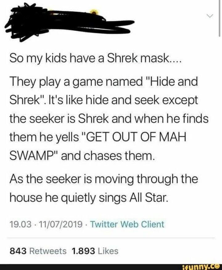 “So my kids have a Shrek mask…They play a game named ‘Hide and Shrek.’ It’s like hide and seek except the seeker is Shrek and when he finds them he yells ‘GET OUT OF MAH SWAMP’ and chases them. As the seeker is moving through the house he quietly sings All-Star.”