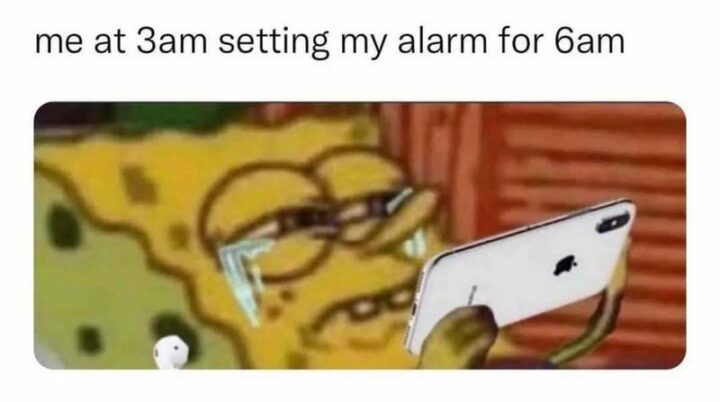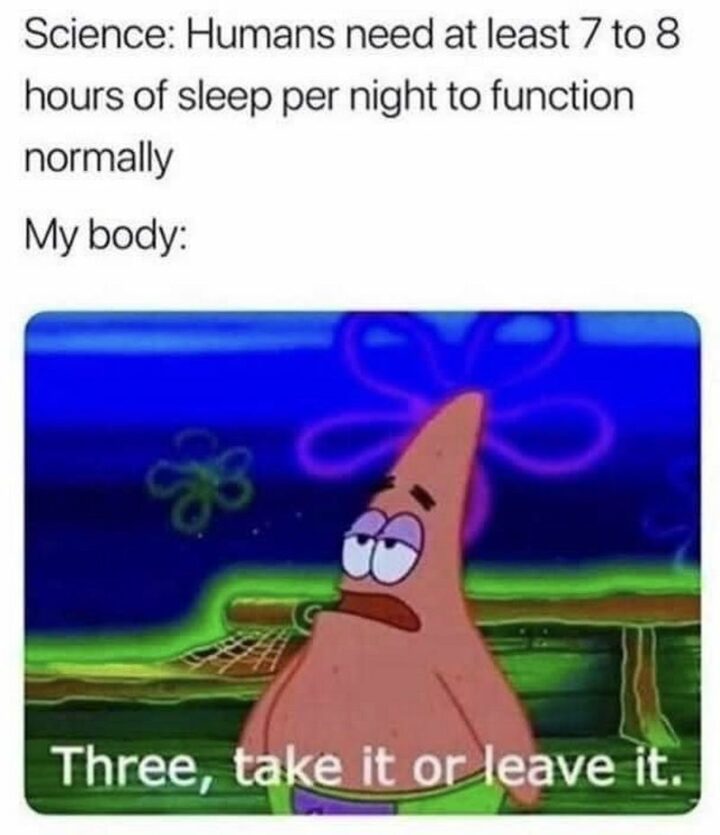 “Science: Humans need at least 7 to 8 hours of sleep per night to function normally. My body: Three, take it or leave it.”