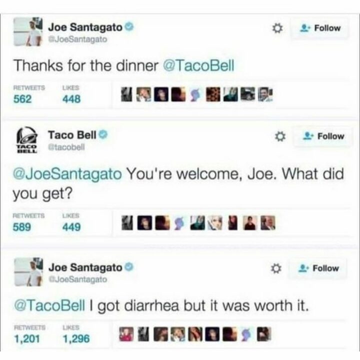 “Thanks for the dinner Taco Bell. You’re welcome, Joe. What did you get? I got diarrhea but it was worth it.”