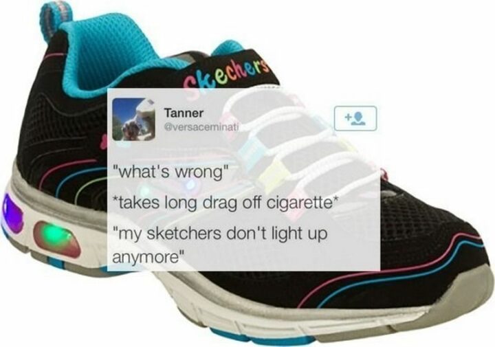 “*what’s wrong* *takes a long drag off cigarette* *my sketchers don’t light up anymore*