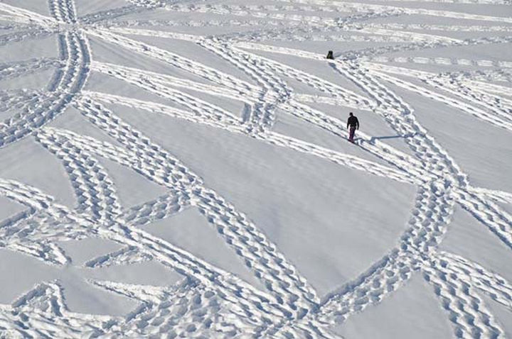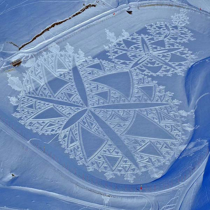 These aren’t “crop circles”. They are intricate pieces of art made in the snow by artist Simon Beck.